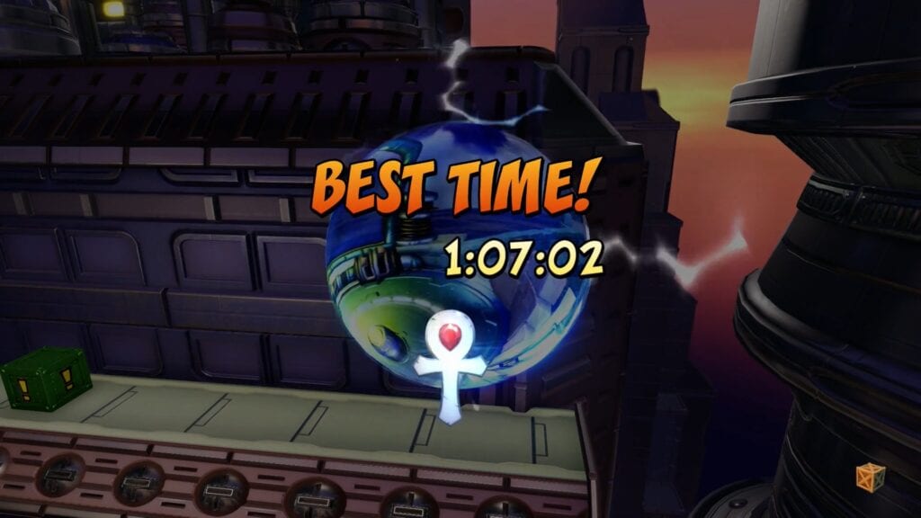 From the get-go, it’s easy to see how much developer Vicarious Visions added to Future Frenzy, with the level boasting a comparatively high visual polish. Showcasing the game’s time trial mode, Crash can be seen zooming through the level at an impressive rate, stopping only for time-pausing crates and dispatching enemies when they pose an immediate threat. Obstacles include laser beams, explosive boxes, and hovercraft goons, all of which threaten to humbly send Crash back to the beginning of the level. Upon reaching the end, Crash is able to score a pretty respectable time as it earns him a relic for his trouble before being warped away to his next adventure.