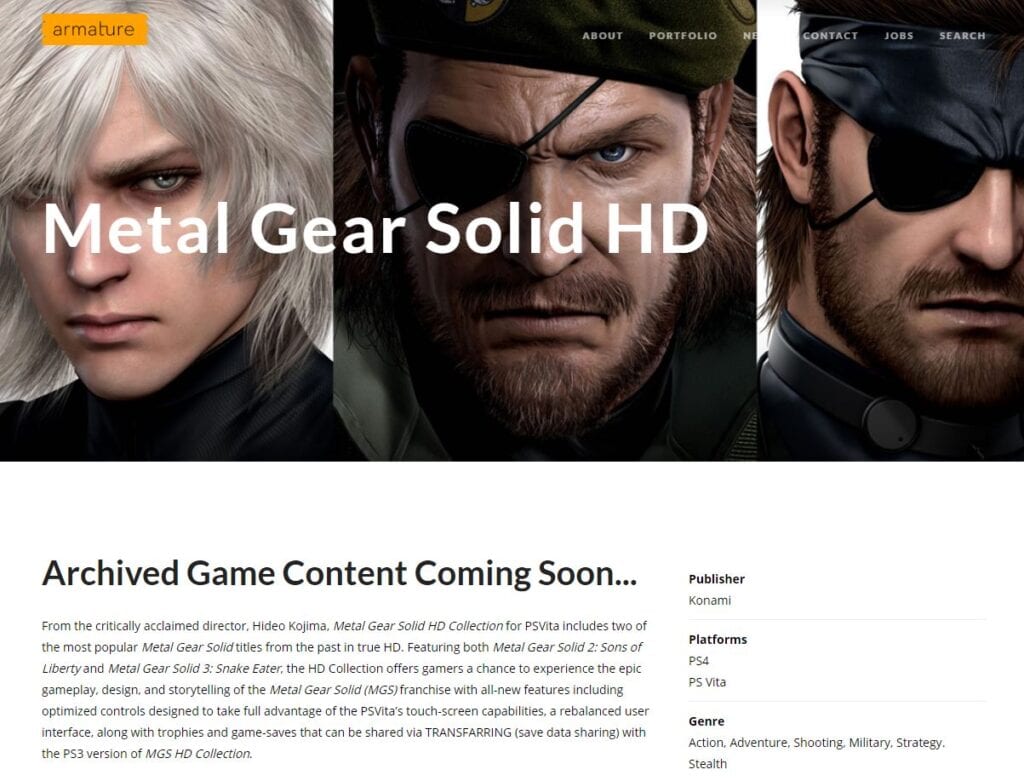 UPDATE 2/11 12:57 PM: Head of Armature Studios Jonathan Zamkoff released a statement showcasing that the rumor was based on a typo: “Unfortunately this was simply a typo by one of our web developers and is neither a leak nor indication that the MGS HD collection is coming to PS4. Or that Armature is working on any new MGS games.”